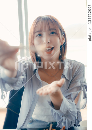 食事をシェアする20代女性の微笑みシーン