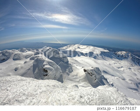 冬季鳥海山頂上からの笙ヶ岳への稜線と日本海