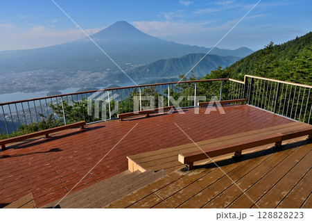 御坂山地の新道峠 FUJIYAMAツインテラスのセカンドテラスから望む富士山と河口湖