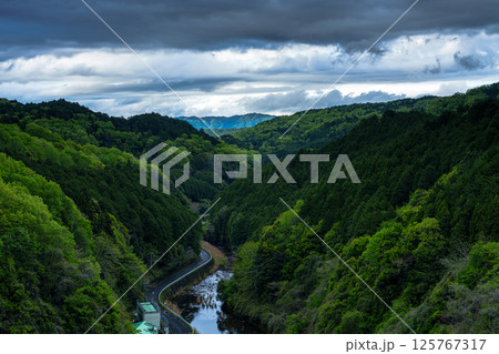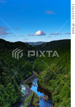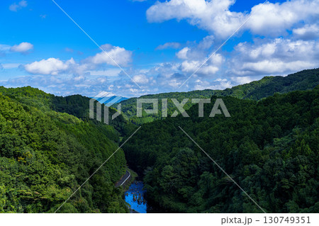 盛夏の奈良布目ダム ダム北側布目川下流域の風景 遠景の笠置の山と深い緑に覆われた渓谷➃