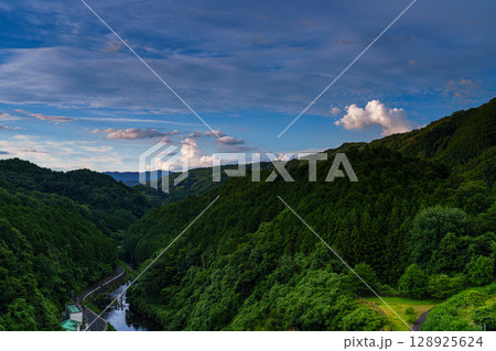 布目ダムの夏 布目川上空の夏空と陽光に照らされる谷筋 遠景の笠置の山と緑深い渓谷②
