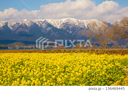 滋賀県琵琶湖 守山第一なぎさ公園の菜の花と雪の比良山系の遠景