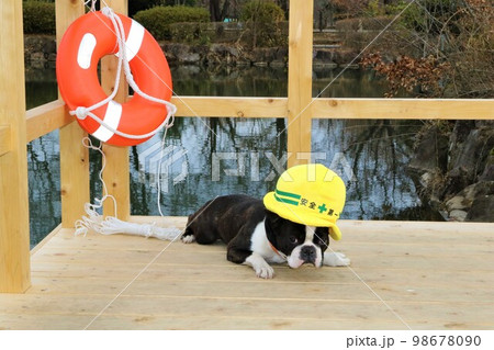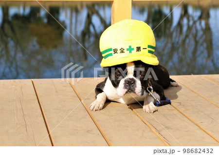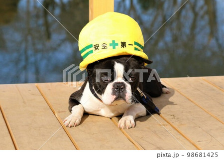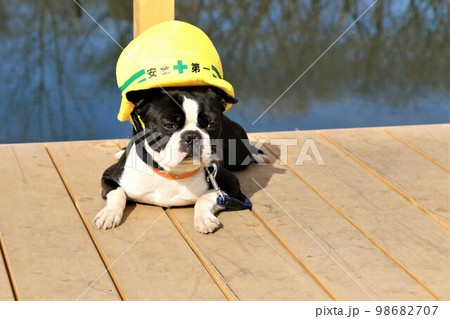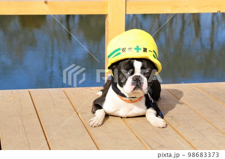 憩いの鶴ヶ島市運動公園太田ヶ谷沼のデッキで見つめる安全第一の帽子を被ったボストンテリアのマイティくん