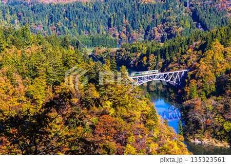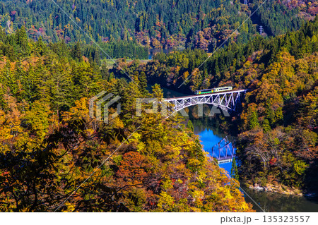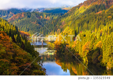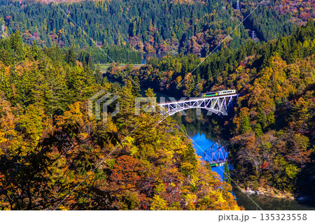 紅葉の萌える山々と只見線第二橋梁を渡る機関車