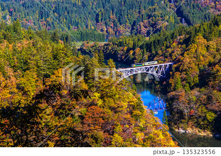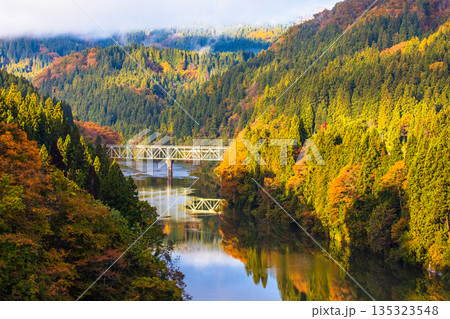 只見線 歳時記橋から望む秋の第二只見川橋梁(福島県三島町、11月)