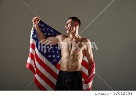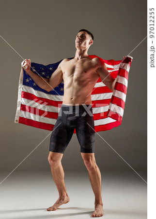 Portrait of young sportsman standing with USA flag on his shoulders and expressing winner emotions. Win, success, sport, achievements