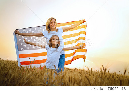 Mother and daughter with American Flag in a beautiful wheat field