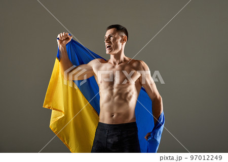 Portrait of young sportsman standing with Ukraine flag on his shoulders and expressing winner emotions. Win, success, sport, achievements