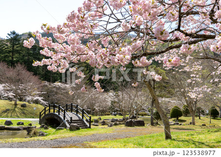 満開の八重桜と橋のある和な風景