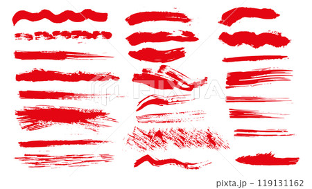 Collection of red brush strokes of different shapes and sizes, wavy and straight lines made with ink, grunge paint roller, vector brush stroke, red stripes isolate, set of drawn red brush strokes