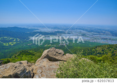 秋の茨城の筑波山 男体山付近の立身石の展望台から南側(関東平野など)の眺望
