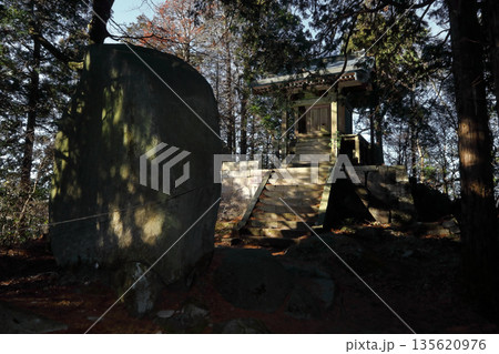 ロマンチック茨城(筑波連山第二の高峰の頂上に巨石に守られた加波山三枝紙神社本宮本殿。)桜川市、真壁町