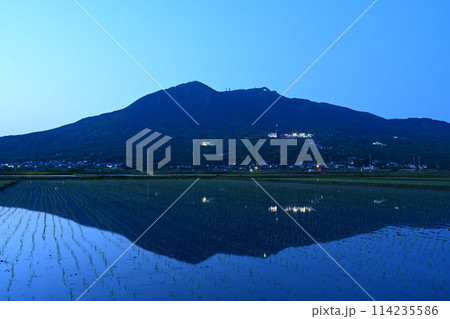 霞がかった霞ヶ浦から望む夕暮れ時の筑波山ののどかな風景