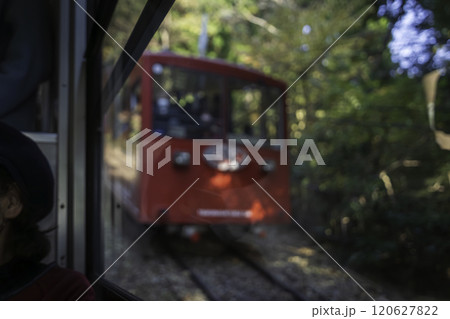 茨城県秋の筑波山の登山道から見るケーブルカーのすれ違い