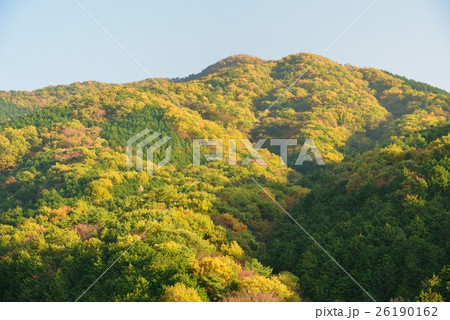 快晴の下、色鮮やかに紅葉した茨城県の秋の宝篋山(ほうきょうさん)