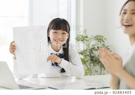 学習塾でテストの結果を喜ぶ女の子 小学生