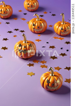 Cute festive Halloween pumpkin lanterns amidst colorful confetti and gold decor on a lilac background.