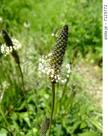 自然 植物 ヘラオオバコ、夏、道ばたでひょろ長い茎の先に小さい花をたくさんつけた姿を見かけます