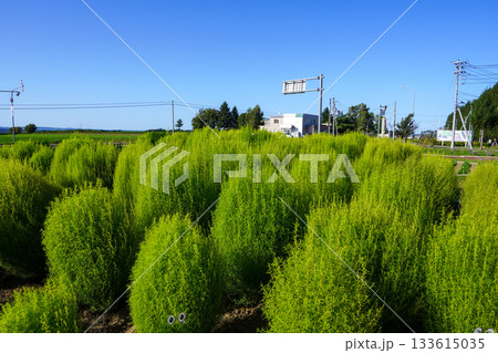 青空と緑のコキアの丘のある風景