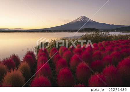 河口湖 大石公園 赤く染まるコキアと富士山