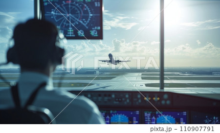 管制塔から離陸中の旅客機を監視する管制官:AI作品