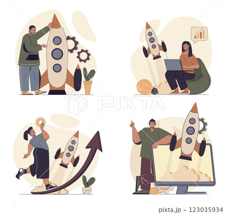 Business startup concept scenes set in flat web design. People in situations of launching new project, working at project, brainstorming, planning process, attracting investment. Vector illustrations.