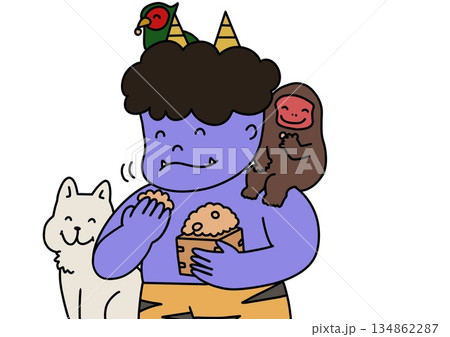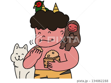 赤鬼と青鬼の子供と白い犬のやさしい手描き風イラスト 節分・豆まき・おたより・子ども向け