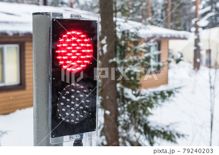 Close-up of Two-color traffic light. Winter landscape background