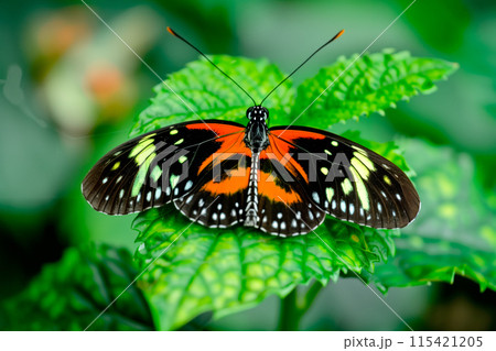 Beautiful Double-banded Red Postman butterfly rests among the foliage of a garden