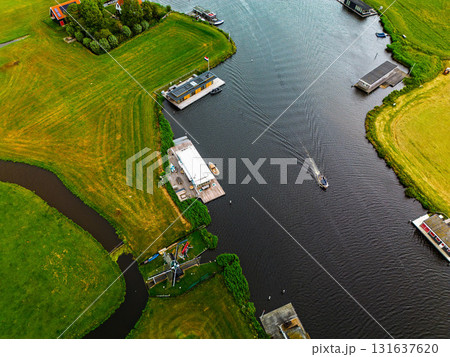 Aerial view of canal with moving boat, docks, windmill, and riverside buildings lush fields and water infrastructure blend tradition and recreation in a tranquil rural setting.