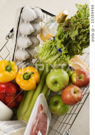 Overhead view of groceries in basket