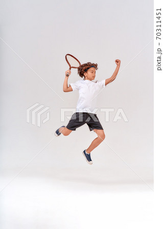 Little winner. Full-length shot of a teenage boy jumping with a tennis racket isolated over grey background, studio shot.