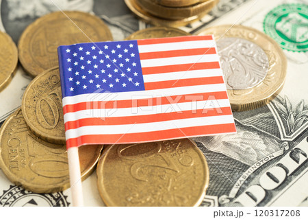 USA America flag on coin and banknote money, finance trading investment business currency.