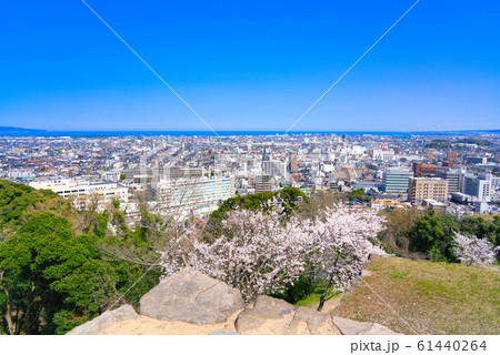 桜咲く春の米子城跡と米子市内と日本海