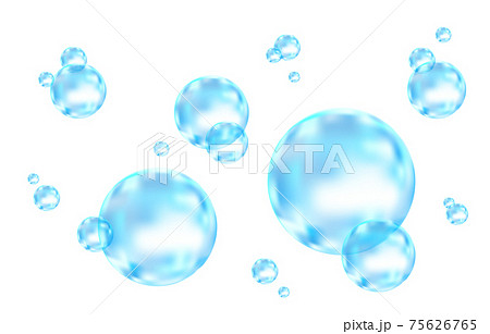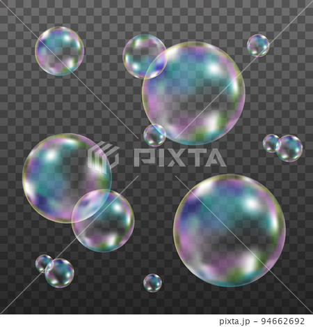 Fizzy blue, yellow, pink, black bubbles on transparent background.