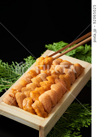 木箱に入ってる高級食材のウニを黒背景で撮影