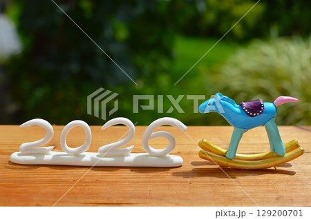 白背景に紙粘土の馬と門松飾りの年賀素材