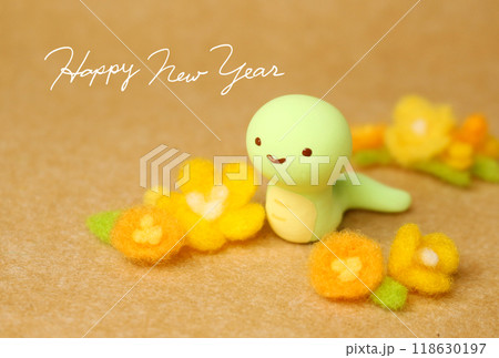 花に囲まれたへびの置物の年賀状2025 賀詞付き