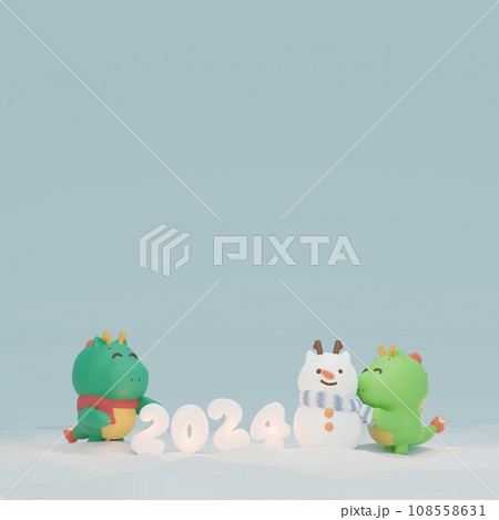 2024の文字と雪だるまを作っている小さな竜