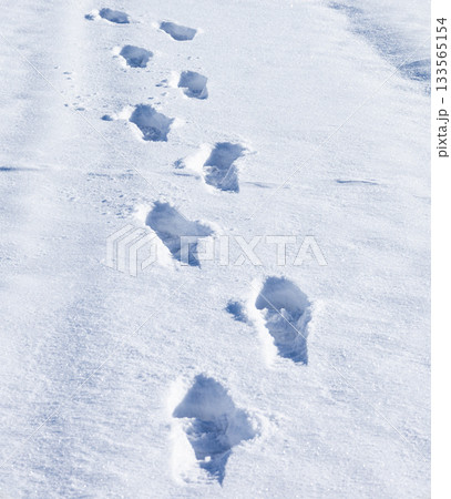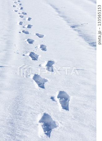 真冬の北海道の雪が積もった歩道を歩いた足跡がある風景