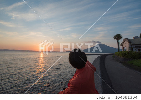 鹿児島県垂水市の国道220線沿いにある荒崎パーキングから観える夕焼けと活火山桜島と海面と女性