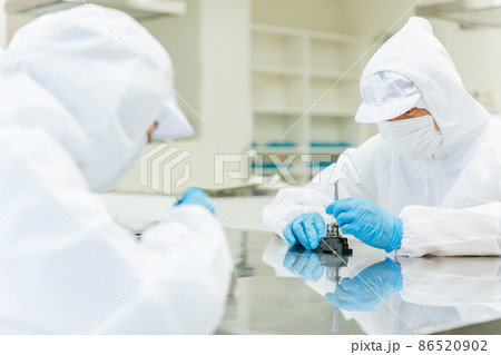 工場のクリーンルームで精密機器を扱う男性と検査する女性