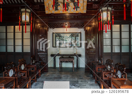 The image shows a Shanghai room with carved wooden furniture, ornate lanterns, and a landscape painting. Dark wood paneling and frosted glass doors are present.