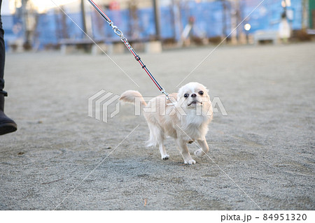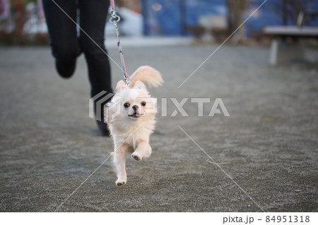 公園で飼い主と一緒に走ってくる、クリーム色のロングコートチワワ