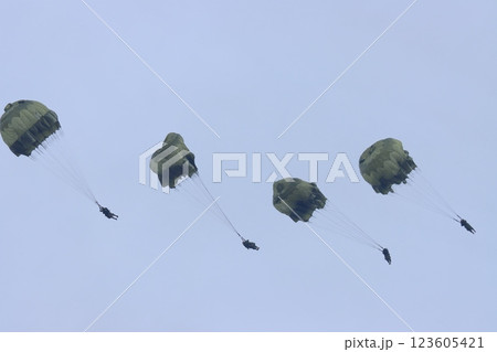 ヘリコプターから降下するレンジャー 空挺降下 落下傘降下訓練 特殊部隊