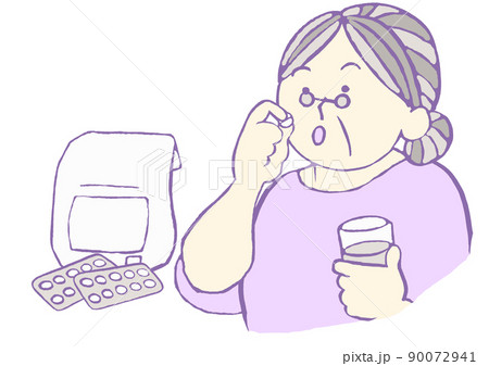 認知症進行抑制剤をコップの水で内服する軽度認知症の高齢女性のイラスト 薬袋文字なし