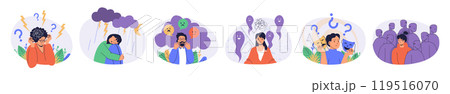 Mental health problem concept set with characters in flat design for web. People feeling negative emotions and has anxiety, crying, stress and nervous illness, suffering fears. Vector illustrations.