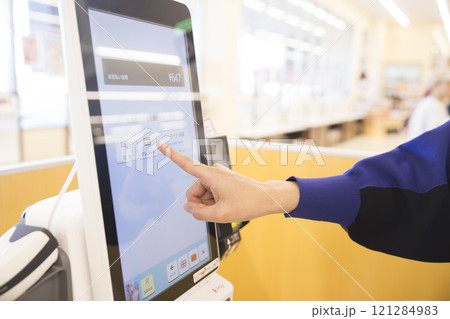 スーパーのセルフレジで精算をする若い女性