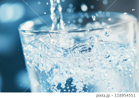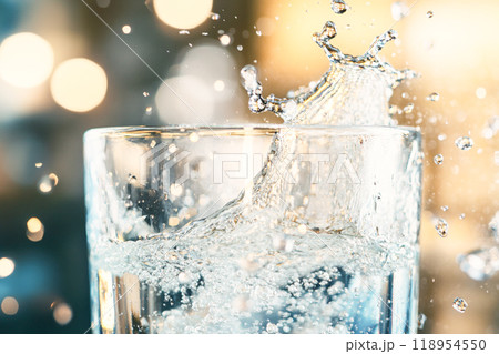 グラスに注ぐミネラルウォーターと弾ける水滴_