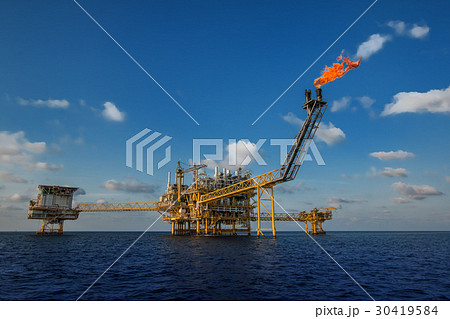 石油精製プラントの煙突から排出される煙とフレアスタック